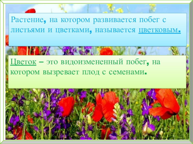 Растение, на котором развивается побег с листьями и цветками, называется цветковым.