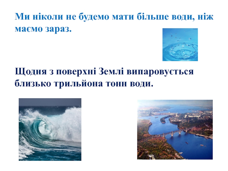 Слайд 10Ми ніколи не будемо мати більше води, ніж маємо зараз.