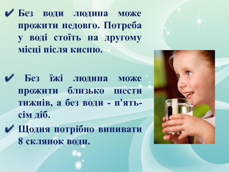 Слайд 14Без води людина може прожити недовго. Потреба у воді стоїть на