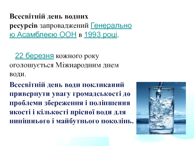 Слайд 9Всесвітній день водних ресурсів запроваджений Генеральною Асамблеєю ООН в 1993 році.
