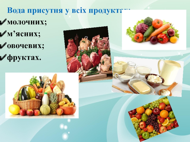 Слайд 13Вода присутня у всіх продуктах: