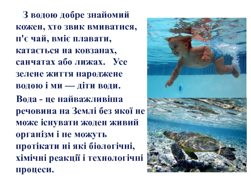 п'є чай, вміє плавати, катається на ковзанах, санчатах або лижах. Усе зелене життя народжене водою і ми — діти води.