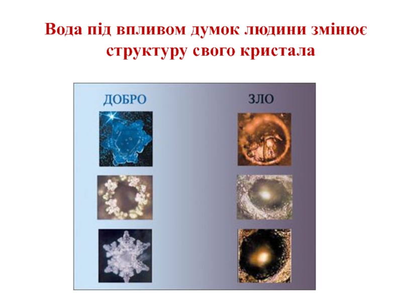 Слайд 25 Вода під впливом думок людини змінює структуру свого кристала
