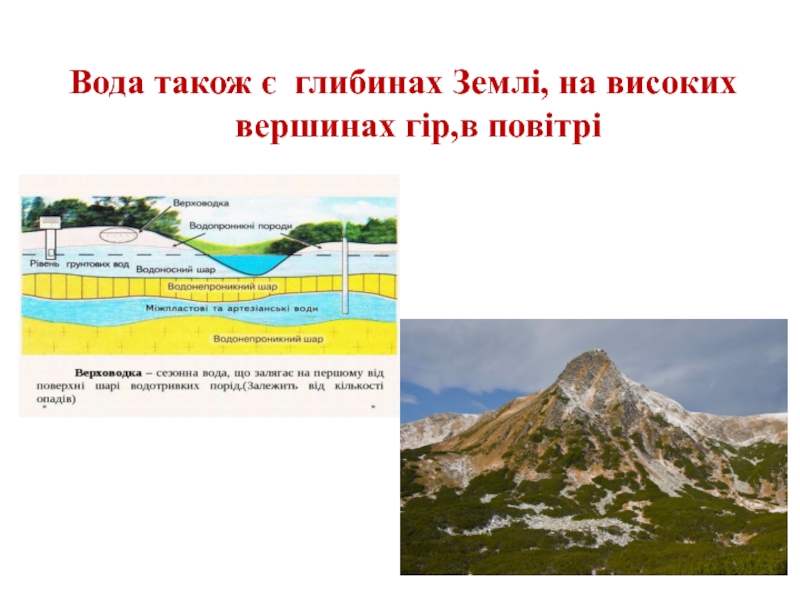 Слайд 7Вода також є глибинах Землі, на високих вершинах гір,в повітрі