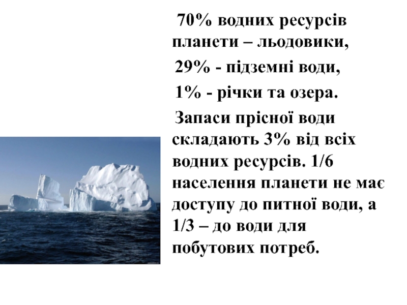 Слайд 8 70% водних ресурсів планети – льодовики,