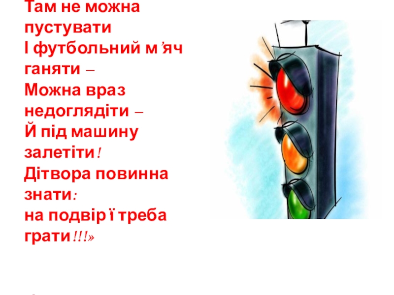 всім не забувати, Що дороги, де машини, - Це не місце для розваги! Там не можна пустувати І футбольний м’яч ганяти – Можна враз недоглядіти – Й під машину залетіти! Дітвора повинна знати: на подвір'ї треба грати!!!»