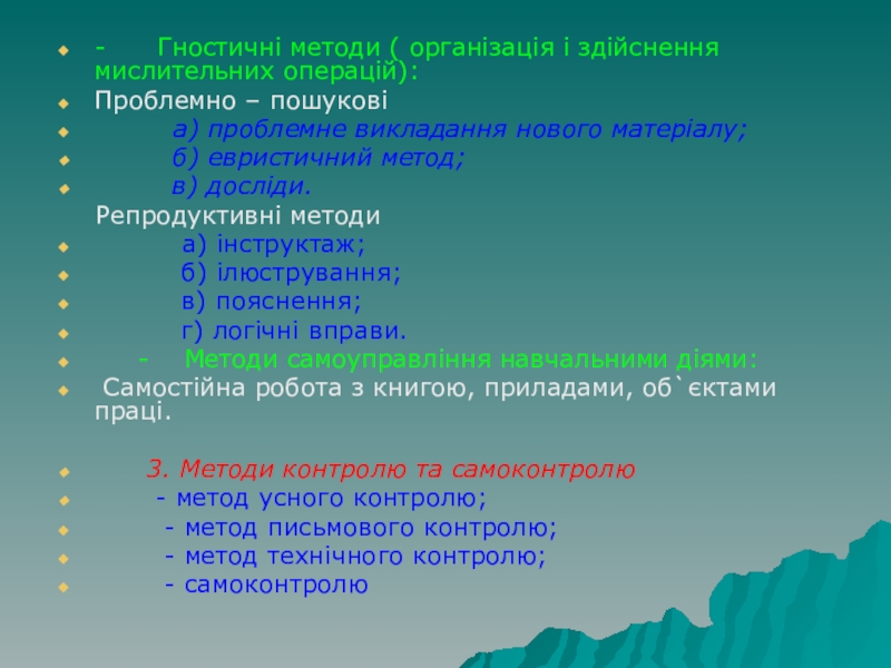 - Гностичні методи ( організація і здійснення мислительних операцій):