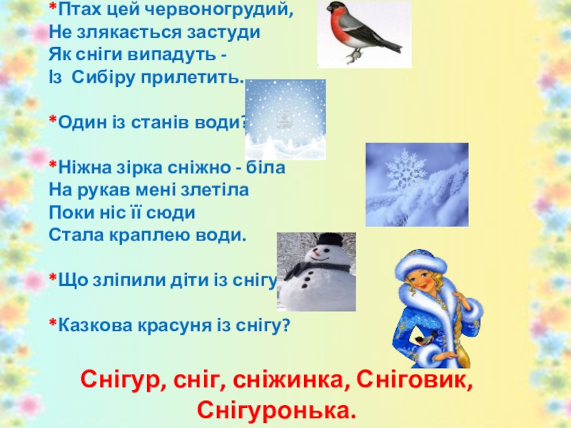 Снігур, сніг, сніжинка, Сніговик, Снігуронька.
