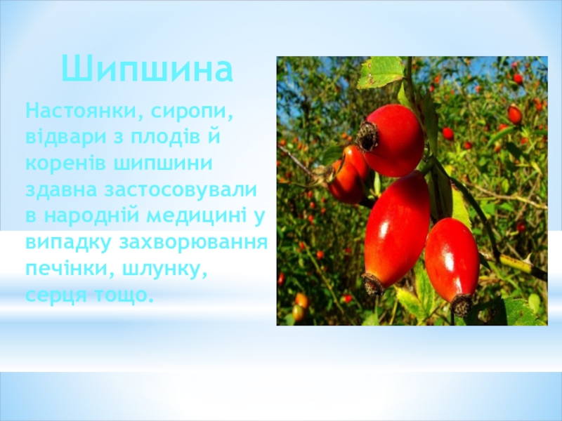 ШипшинаНастоянки, сиропи, відвари з плодів й коренів шипшини здавна застосовували в народній медицині у випадку захворювання печінки,