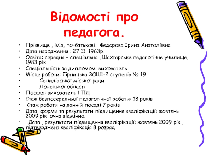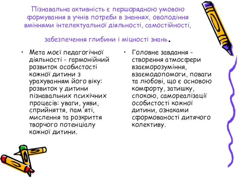 Мета моєї педагогічної діяльності - гармонійний розвиток особистості кожної дитини з урахуванням його віку: розвиток у дитини пізнавальних психічних процесів: уваги, уяви, сприйняття, пам'яті, мислення та розкриття творчого потенціалу кожної дитини.