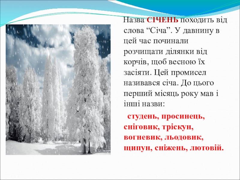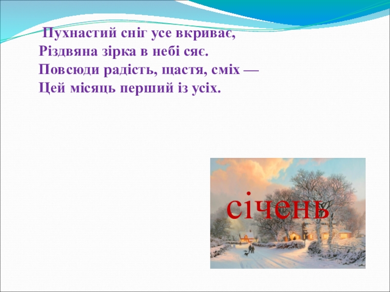 Слайд 1Січень снігом січе, а мороз вогнем пече