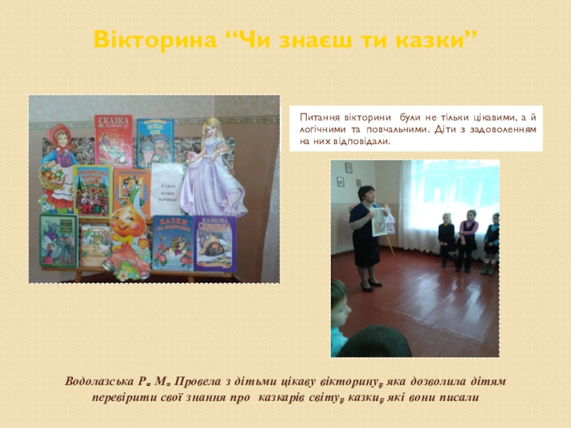 Перед вікториною вчитель 4 класу Водолазська Р. М. підготувала виставку книг з казками , які є в шкільній бібліотеці і їх можна взяти і прочитати