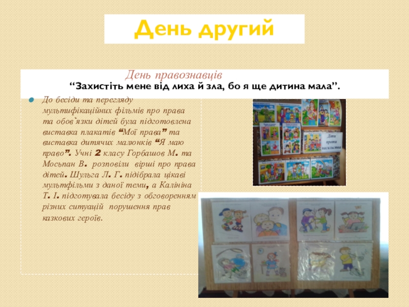 До бесіди та перегляду мультифікаційних фільмів про права та обов`язки дітей була підготовлена виставка плакатів “Мої права” та виставка дитячих малюнків “Я маю право”. Учні 2 класу Горбашов М. та Мосьпан В. розповіли вірші про права дітей. Шульга Л. Г. підібрала цікаві мультфільми з даної теми, а Калініна Т. І. підготувала бесіду з обговоренням різних ситуацій порушення прав казкових героїв.