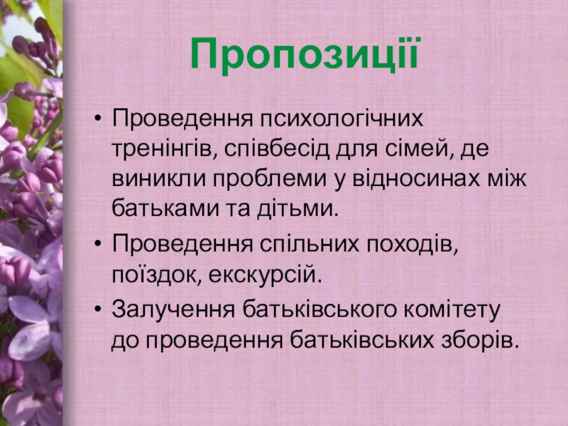 Пропозиції Проведення психологічних тренінгів, співбесід для сімей, де виникли проблеми у відносинах між батьками та дітьми.Проведення спільних