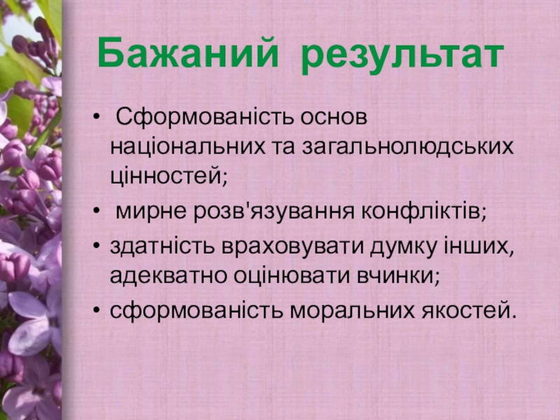Бажаний результат Сформованість основ національних та загальнолюдських цінностей; мирне розв'язування конфліктів;здатність враховувати думку інших,адекватно оцінювати вчинки;сформованість моральних