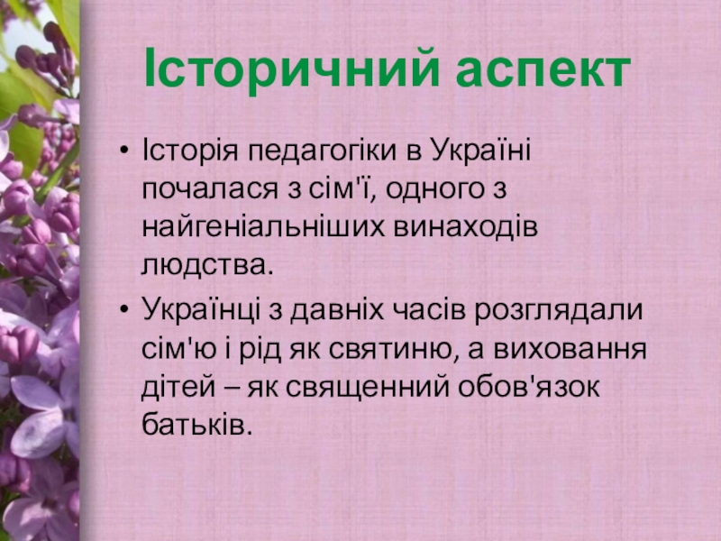 Історичний аспект Історія педагогіки в Україні почалася з сім'ї, одного з найгеніальніших винаходів людства.Українці з давніх часів розглядали сім'ю і рід як святиню, а виховання дітей – як священний обов'язок батьків.