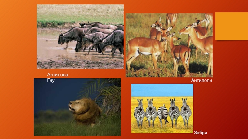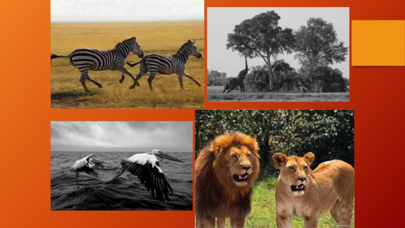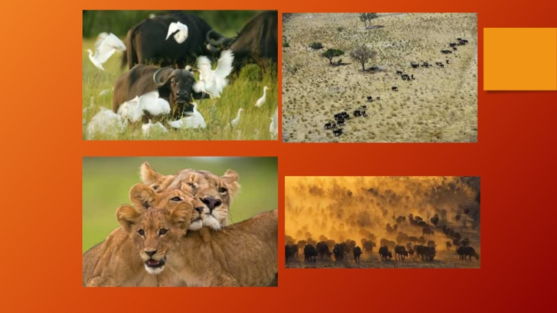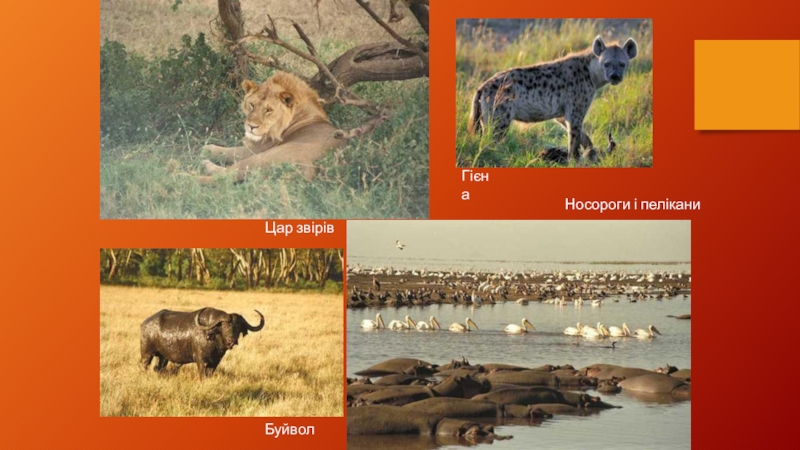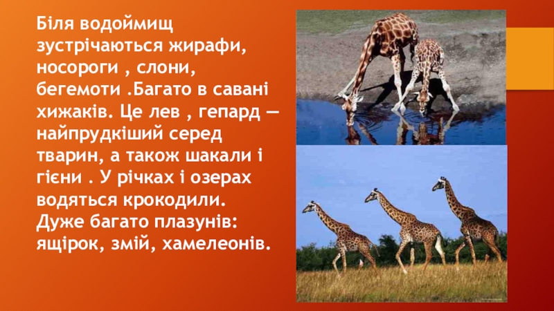 Слайд 27Біля водоймищ зустрічаються жирафи, носороги , слони, бегемоти .Багато в савані хижаків. Це лев , гепард