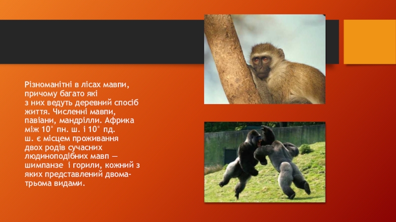 Слайд 11Різноманітні в лісах мавпи, причому багато які з них ведуть деревний спосіб життя. Численні