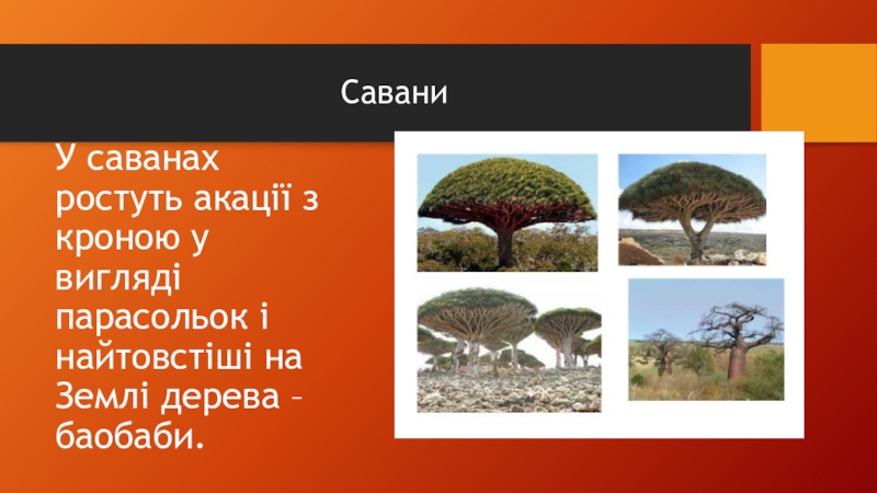 У саванах ростуть акації з кроною у вигляді парасольок і найтовстіші