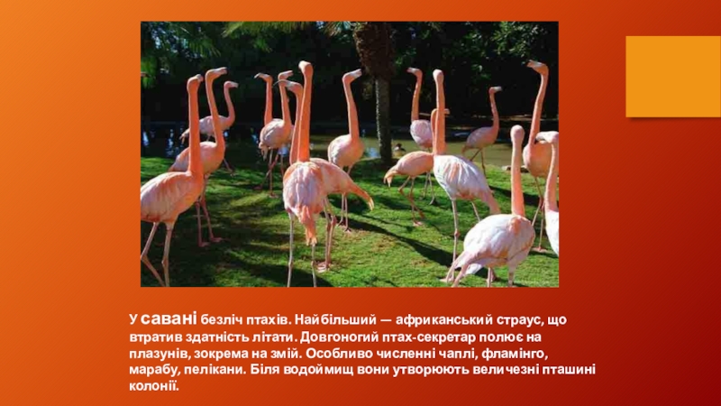 Слайд 26У савані безліч птахів. Найбільший — африканський страус, що втратив здатність