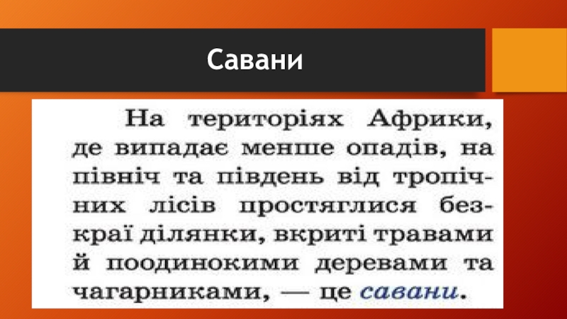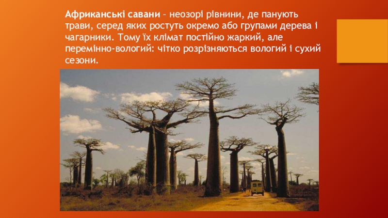 Слайд 22Африканські савани – неозорі рівнини, де панують трави, серед яких ростуть окремо