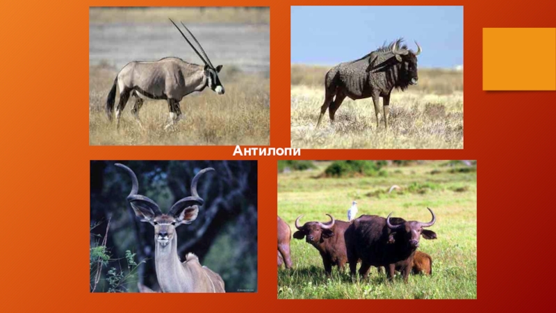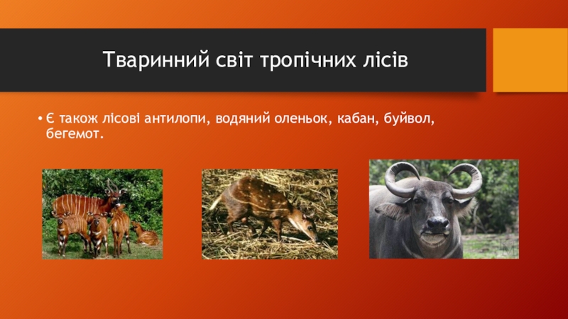 Є також лісові антилопи, водяний оленьок, кабан, буйвол, бегемот.