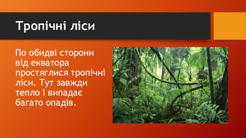 По обидві сторони від екватора простяглися тропічні ліси. Тут завжди