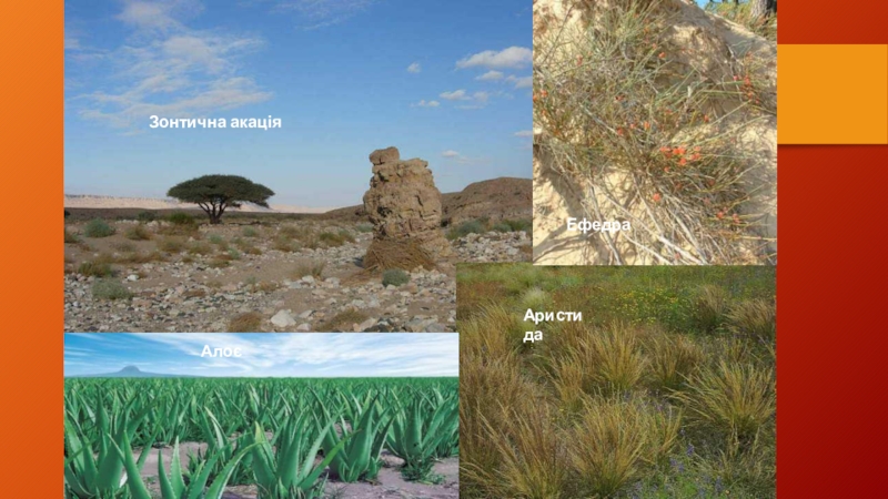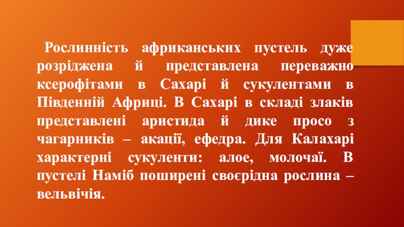 й сукулентами в Південній Африці. В Сахарі в складі злаків представлені аристида й дике просо з чагарників – акації, ефедра. Для Калахарі характерні сукуленти: алое, молочаї. В пустелі Наміб поширені своєрідна рослина – вельвічія.