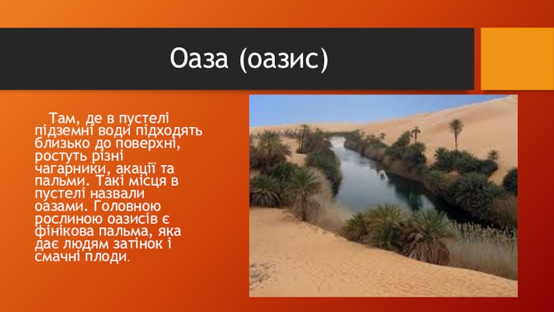 до поверхні, ростуть різні чагарники, акації та пальми. Такі місця в пустелі назвали оазами. Головною рослиною оазисів є фінікова пальма, яка дає людям затінок і смачні плоди.