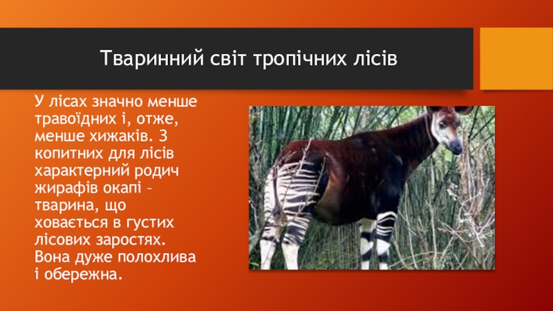 хижаків. З копитних для лісів характерний родич жирафів окапі – тварина, що ховається в густих лісових заростях. Вона дуже полохлива і обережна.