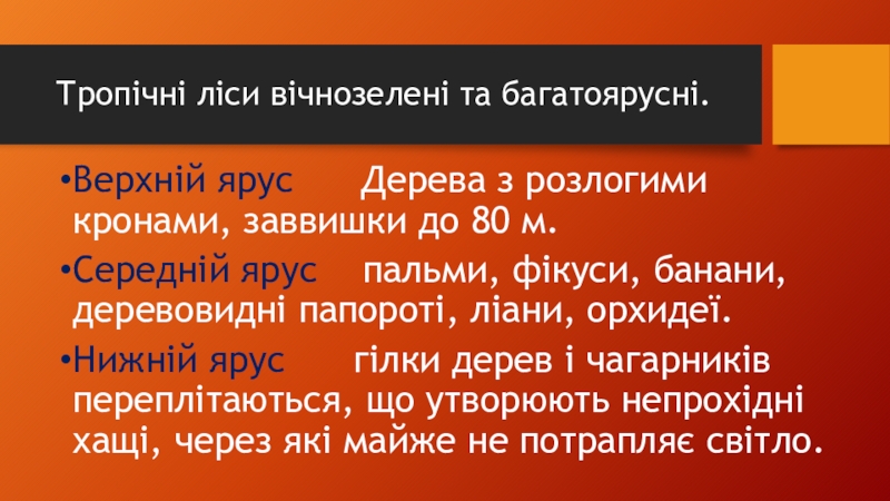 Слайд 4Тропічні ліси вічнозелені та багатоярусні.