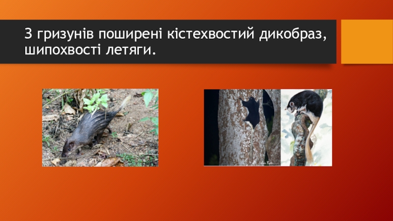 Слайд 10З гризунів поширені кістехвостий дикобраз, шипохвості летяги.