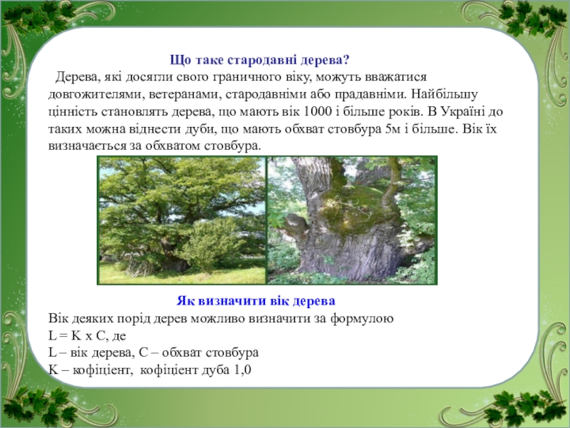 Дерева, які досягли свого граничного віку, можуть вважатися довгожителями, ветеранами, стародавніми або прадавніми. Найбільшу цінність становлять дерева, що мають вік 1000 і більше років. В Україні до таких можна віднести дуби, що мають обхват стовбура 5м і більше. Вік їх визначається за обхватом стовбура.