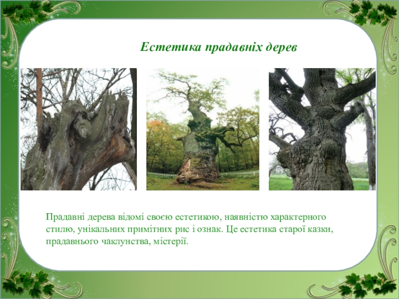 Прадавні дерева відомі своєю естетикою, наявністю характерного стилю, унікальних примітних рис і ознак. Це естетика старої казки, прадавнього чаклунства, містерії.