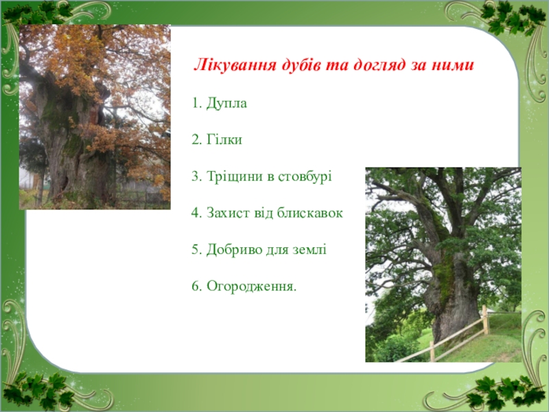 * ознайомитись з правилами лікування дубів та правилами догляду за