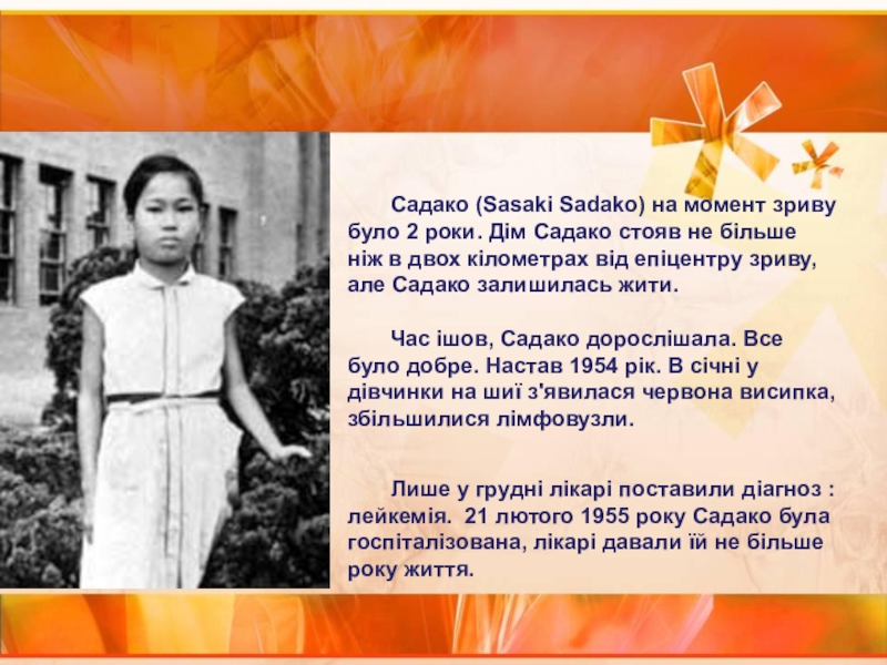 Лише у грудні лікарі поставили діагноз : лейкемія. 21 лютого 1955 року Садако була госпіталізована, лікарі давали їй не більше року життя.