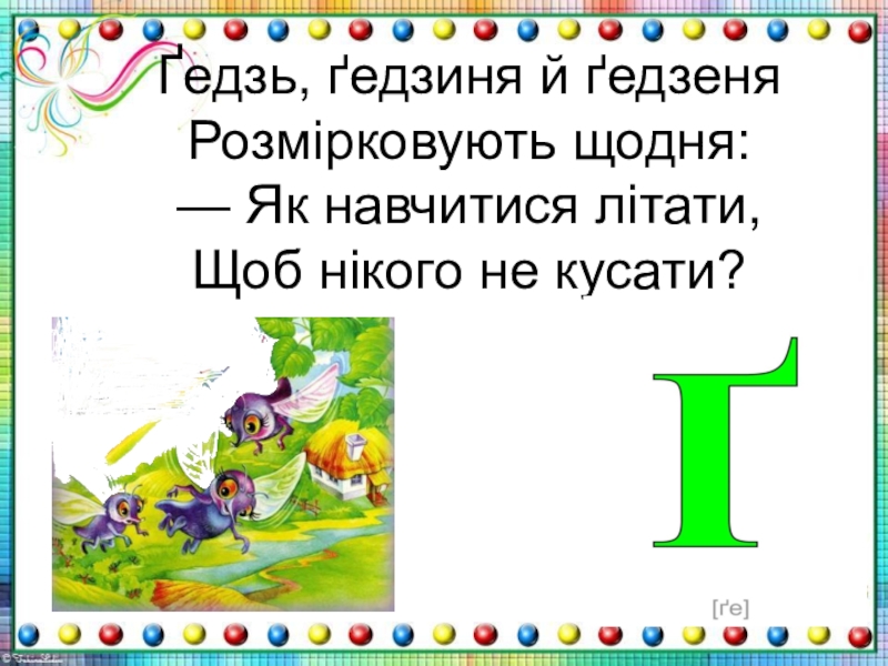 Слайд 12Ґедзь, ґедзиня й ґедзеня  Розмірковують щодня:  — Як навчитися літати,  Щоб нікого не кусати?