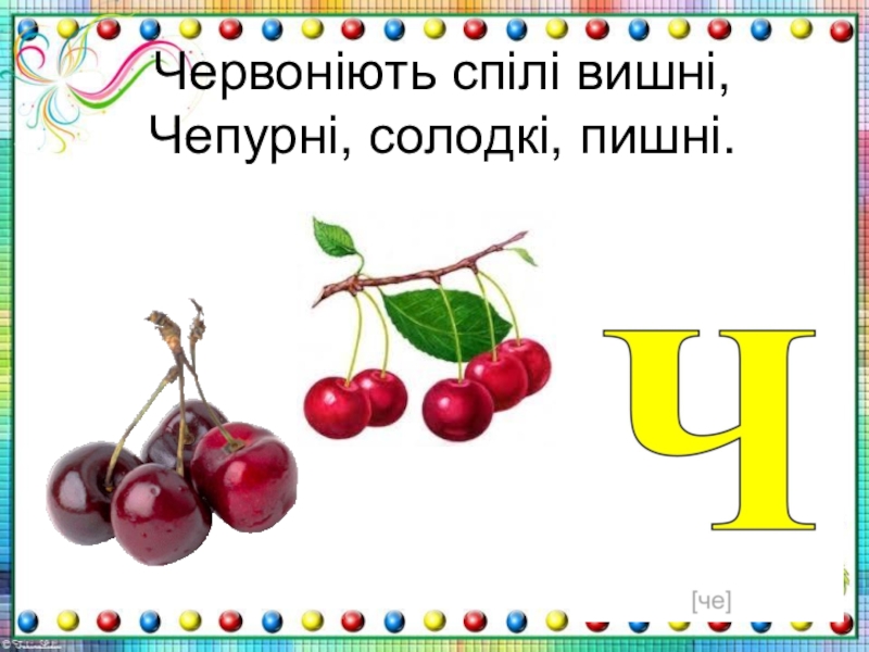 Червоніють спілі вишні,  Чепурні, солодкі, пишні.