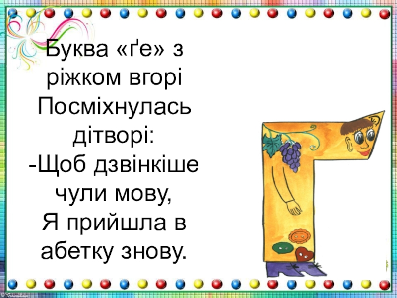 Буква «ґе» з ріжком вгорі Посміхнулась дітворі: -Щоб дзвінкіше чули мову, Я прийшла в абетку знову.