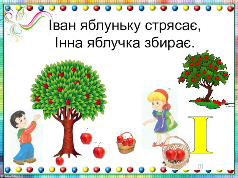 Слайд 27Іван яблуньку стрясає, Інна яблучка збирає.