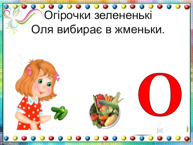 Слайд 41Огірочки зелененькі Оля вибирає в жменьки.