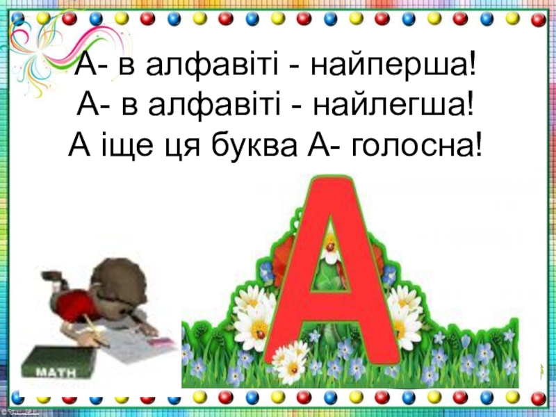 А- в алфавіті - найперша! А- в алфавіті - найлегша! А іще ця буква А- голосна!