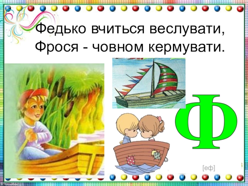 Слайд 53Федько вчиться веслувати, Фрося - човном кермувати.