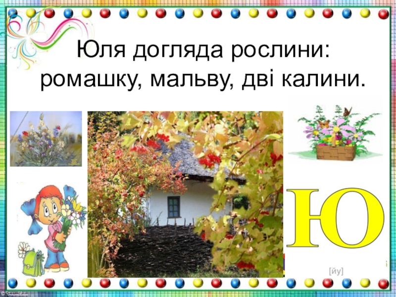 Слайд 65Юля догляда рослини: ромашку, мальву, дві калини.
