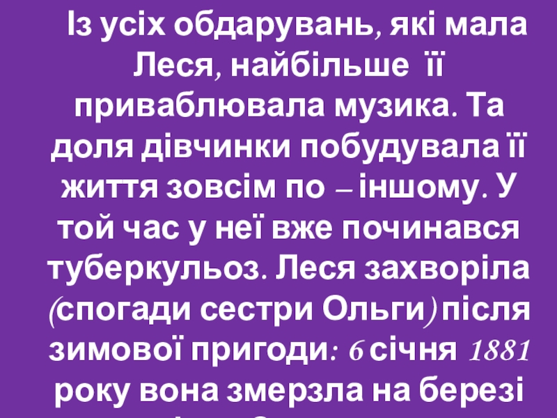 приваблювала музика. Та доля дівчинки побудувала її життя зовсім по – іншому. У той час у неї вже починався туберкульоз. Леся захворіла(спогади сестри Ольги) після зимової пригоди: 6 січня 1881 року вона змерзла на березі річки Стир, коли спостерігала, як у переддень Різдва освячують воду.