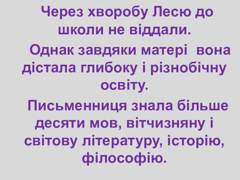Слайд 30 Через хворобу Лесю до школи не віддали.