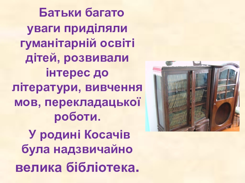 Слайд 9 Батьки багато уваги приділяли гуманітарній освіті дітей, розвивали інтерес