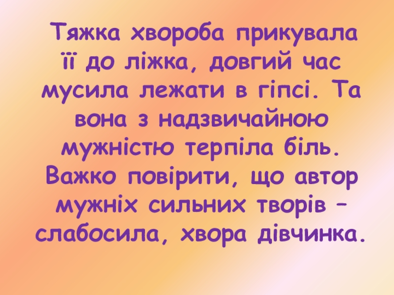 мусила лежати в гіпсі. Та вона з надзвичайною мужністю терпіла біль. Важко повірити, що автор мужніх сильних творів – слабосила, хвора дівчинка.
