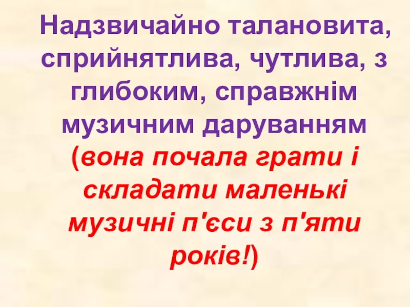 Слайд 20 Надзвичайно талановита, сприйнятлива, чутлива, з глибоким, справжнім музичним даруванням