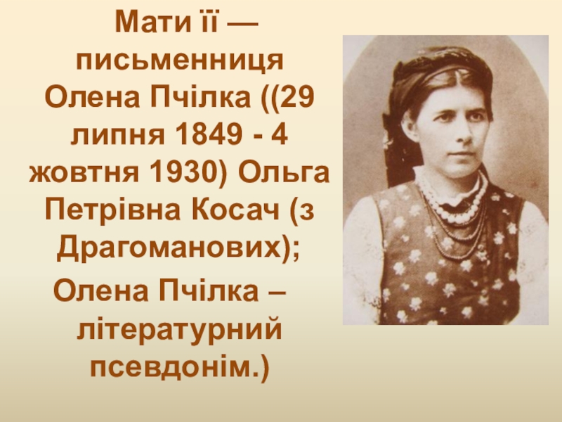 Слайд 4 Мати її — письменниця Олена Пчілка ((29 липня 1849